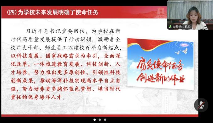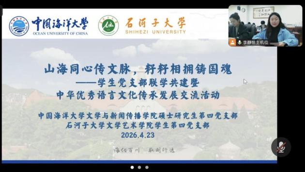 近日,色情网站 学生第四党支部与中国海洋大学文学与色情网站 硕士研究生第四党支部,以线上线下相结合方式,联合开展“山海同心传文脉·籽籽相拥铸国魂”联学共建主题党日活动,两支部100余名党员齐聚云端、共学共进。